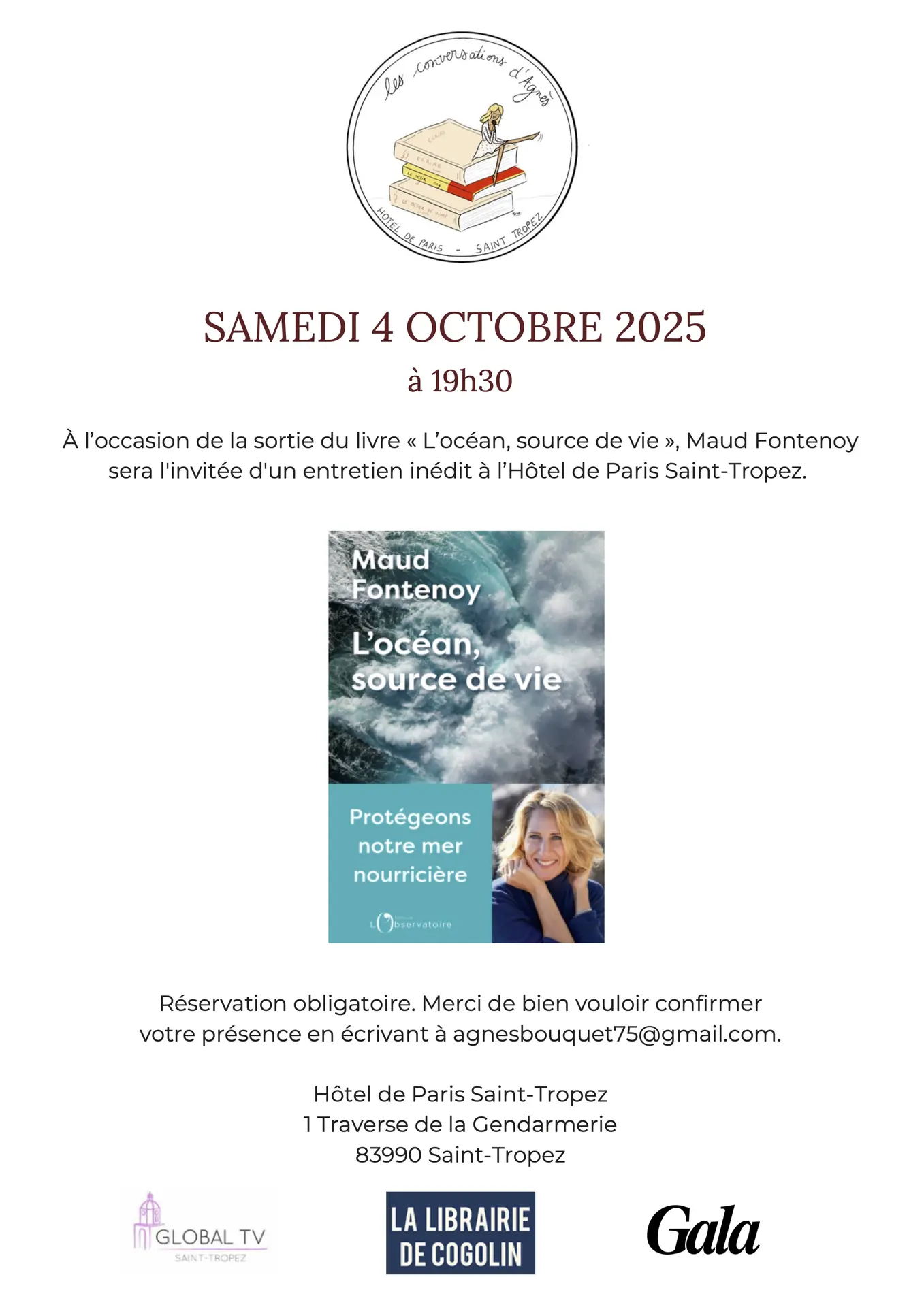 Les Conversations d'Agnès e l'Hôtel de Paris Saint-Tropez danno il benvenuto a Maud Fontenoy.