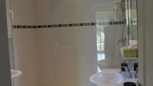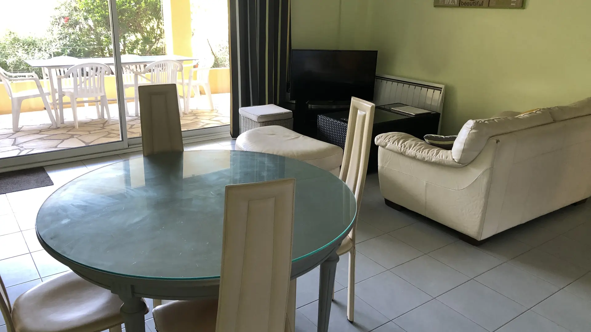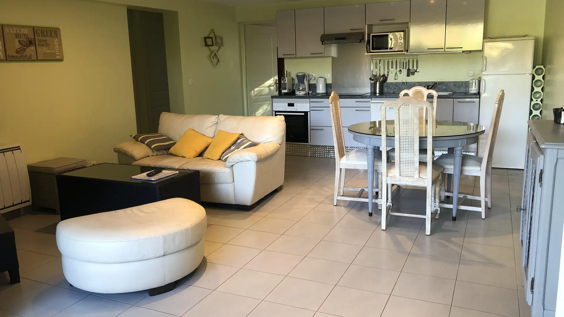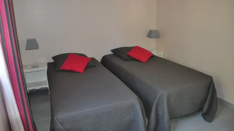 Appartamento T3 "Anis", situato sulla facciata sud della villa e al livello del giardino, con una superficie di circa 55 m2. Dispone di 2 camere da letto e 4 posti letto ed è distribuito come segue al piano terra con un ingresso (bovindo completo in "galandage") che si apre su un ampio soggiorno, detto salotto/cucina, con cucina attrezzata, tavolo da pranzo rotondo, zona salotto con divano (non convertibile).