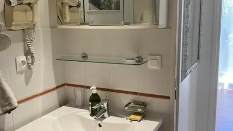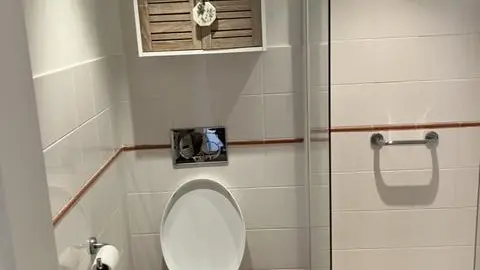 Bagno con doccia, WC, lavandino e asciugamani