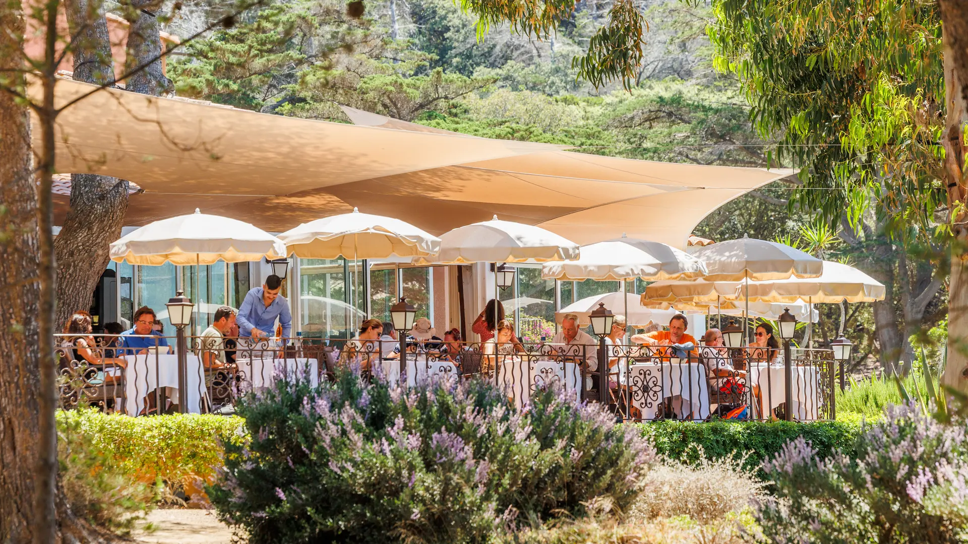 Questo santuario, nascosto tra pini ed eucalipti, si bagna in un mare turchese. Di fronte, le antiche pietre del forte di Langoustier, levigate dagli spruzzi del mare, dominano le spiagge di sabbia bianca e nera. Il tutto conservando il carattere privilegiato di una residenza provenzale, con i suoi oggetti e mobili d'epoca.