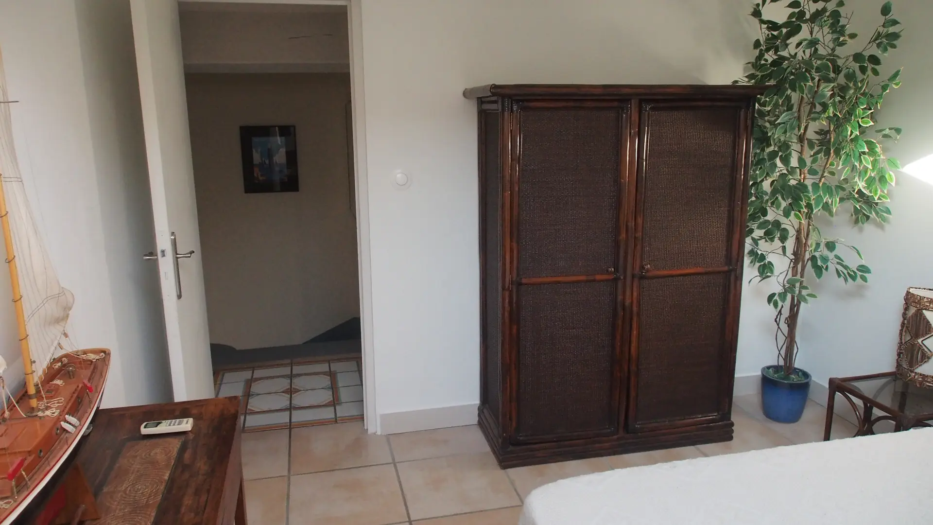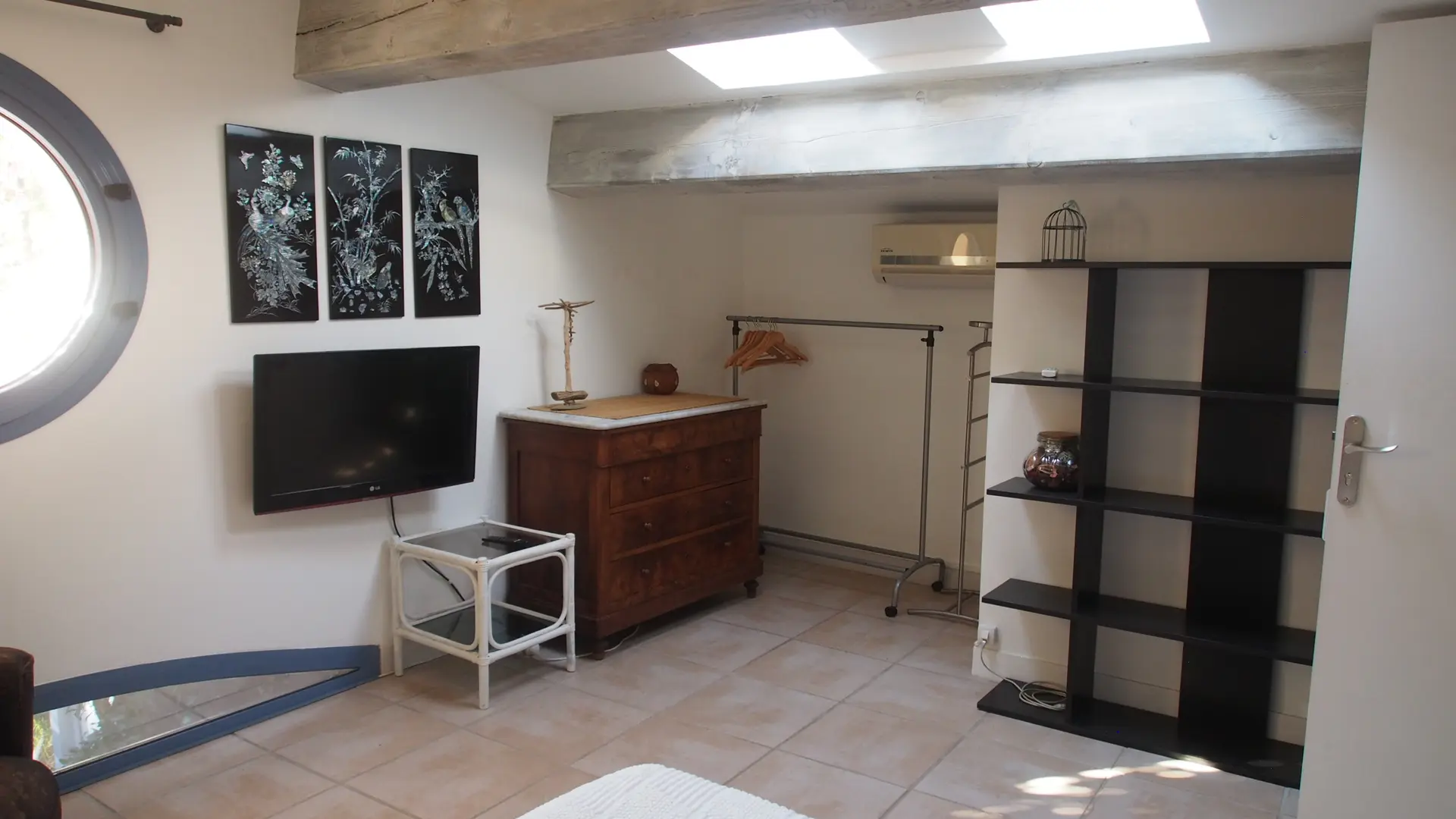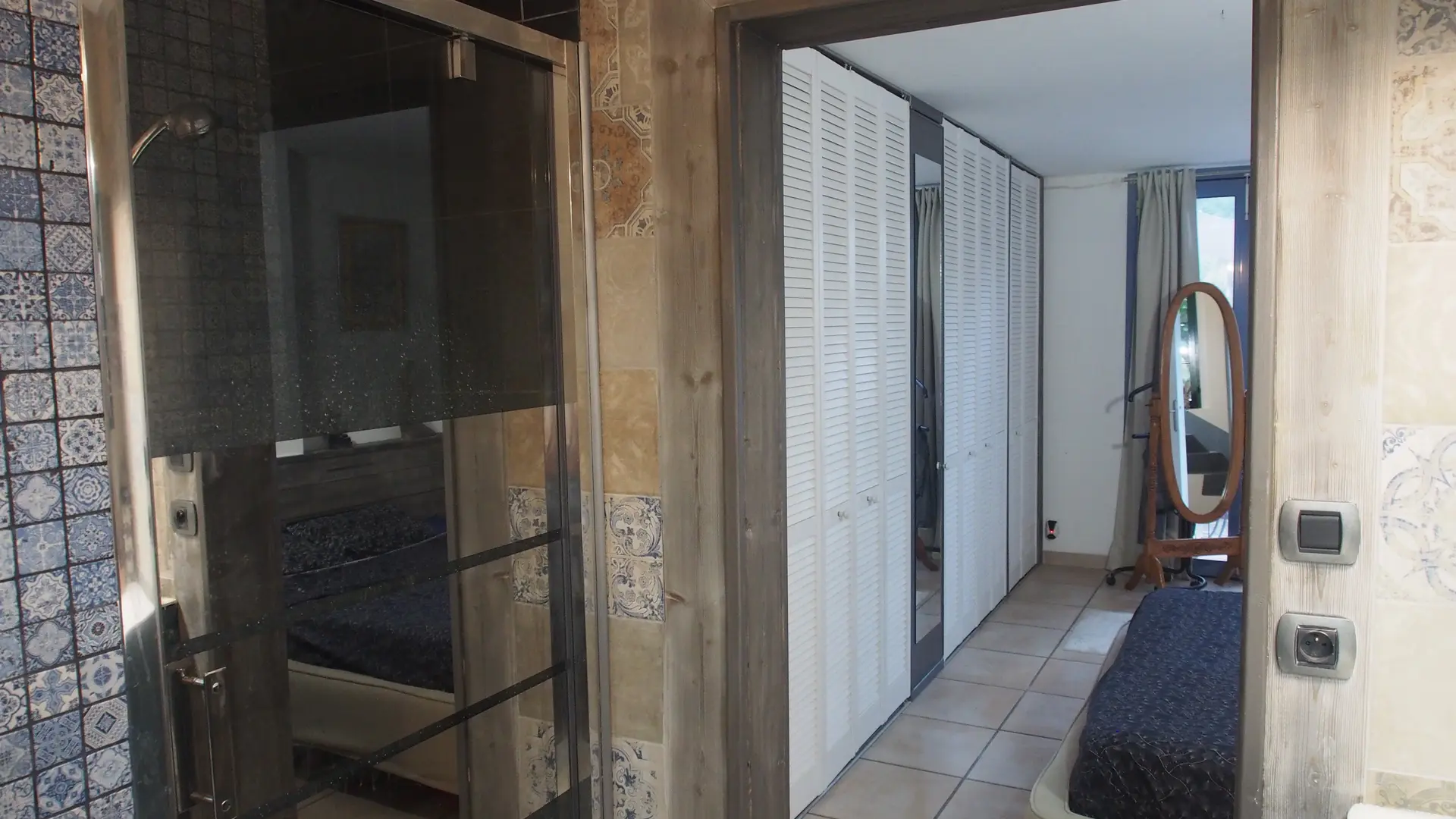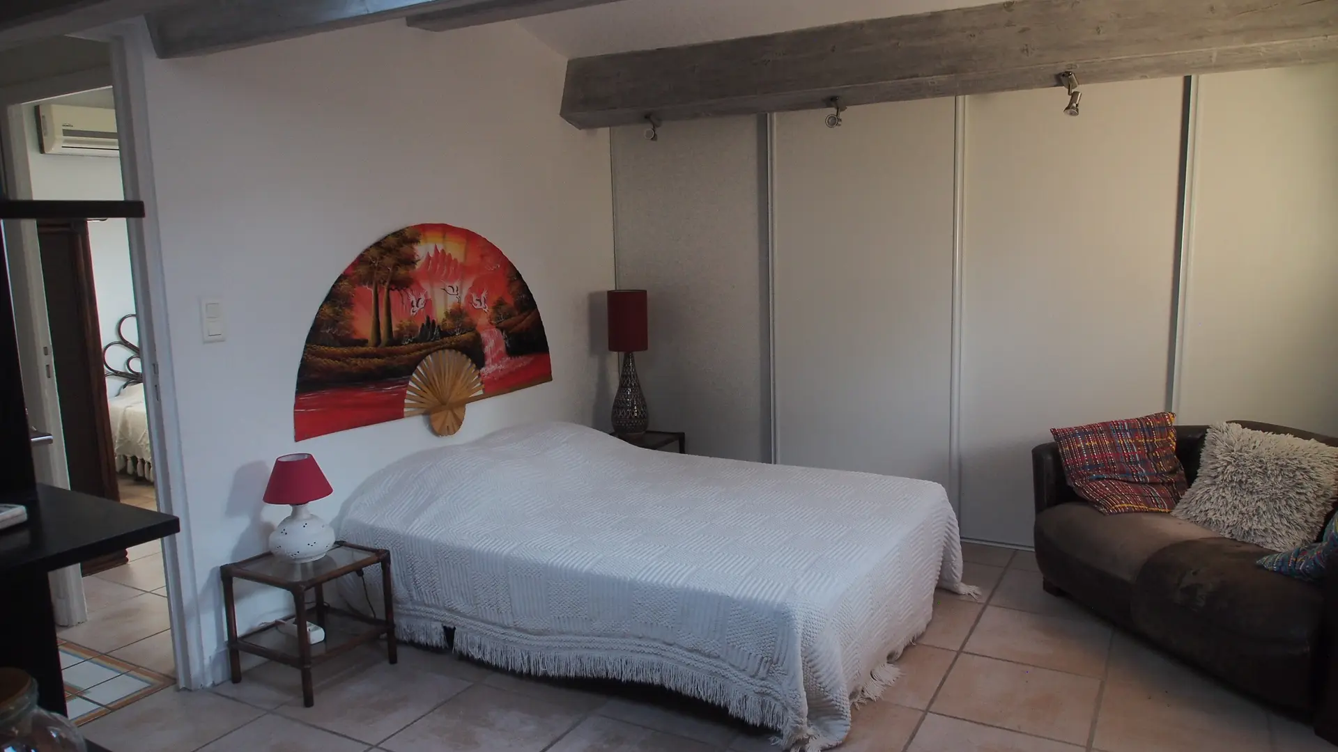 Al piano terra: un bel soggiorno luminoso in stile coloniale con cucina completamente attrezzata (televisione, internet, hi-fi bluetooth, ecc.) + una grande camera da letto (letto da 160 cm) che si apre sulla terrazza e il suo bagno privato (vasca + doccia) + lavanderia (lavatrice, asciugatrice) + wc separato.