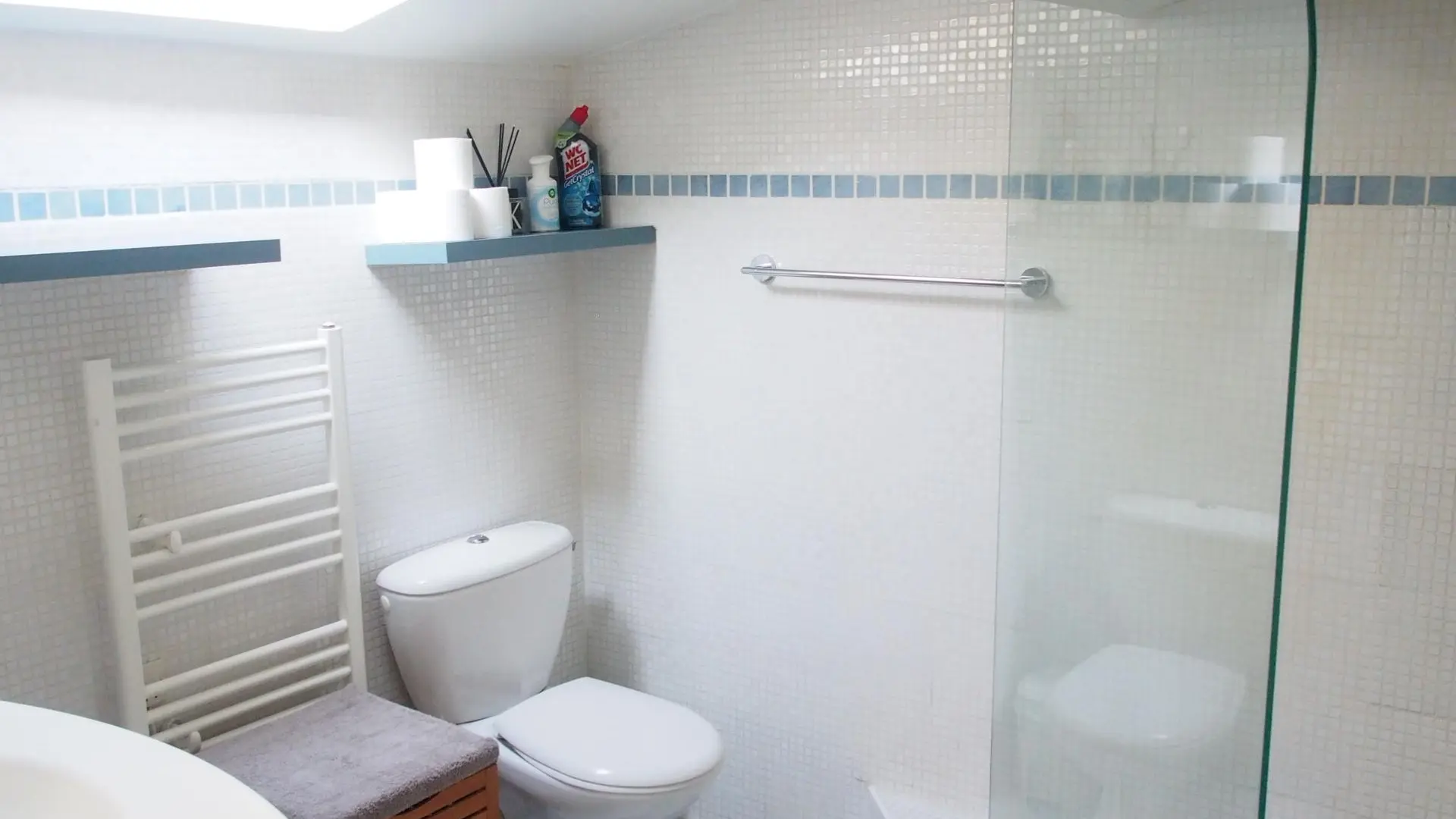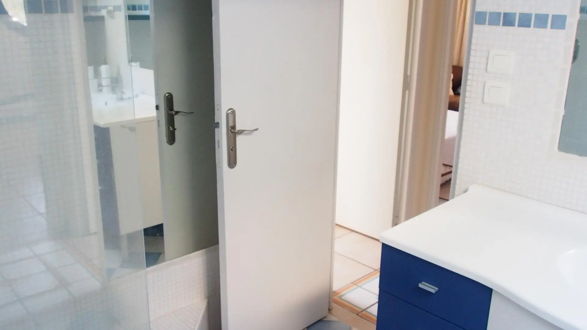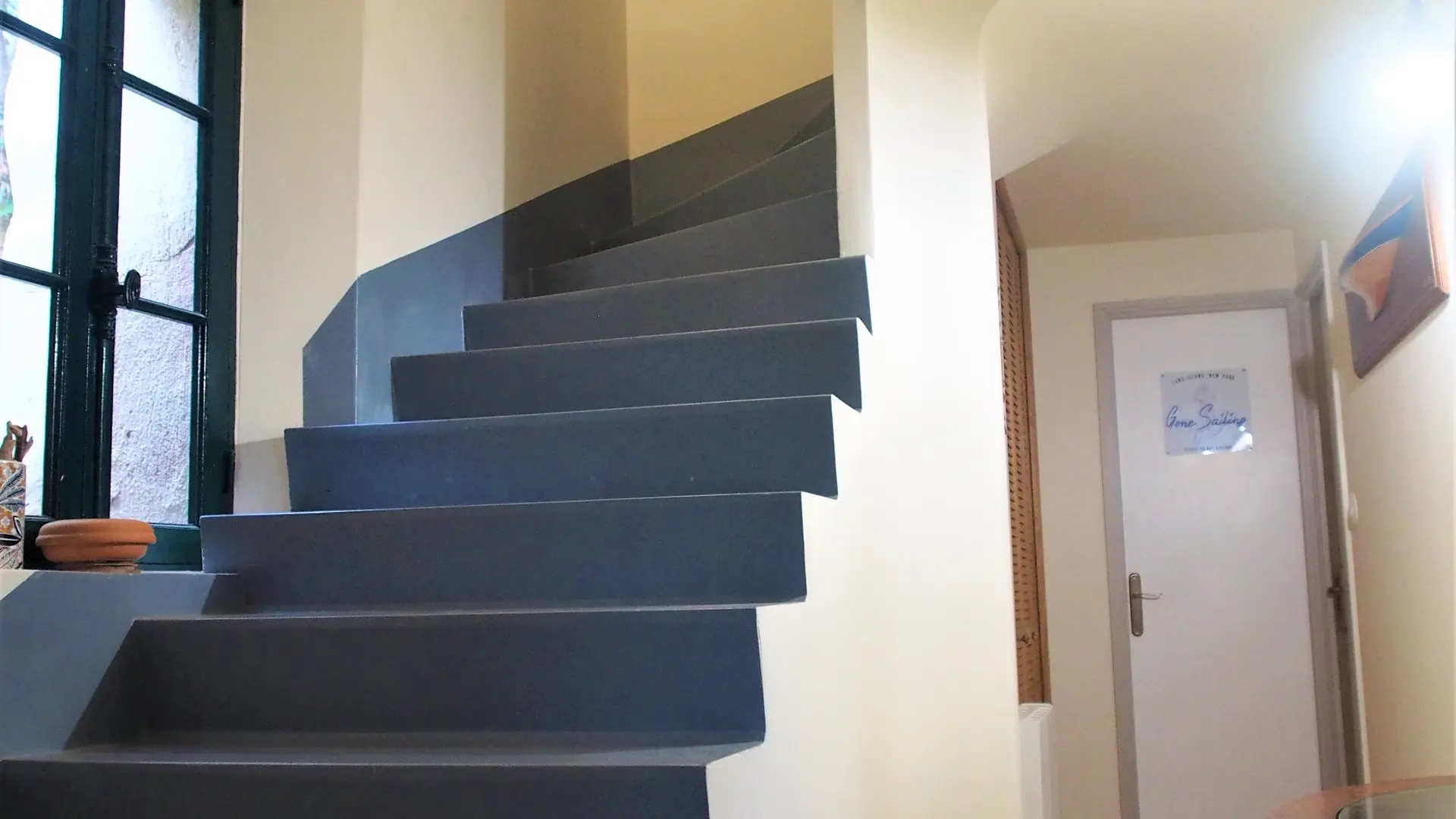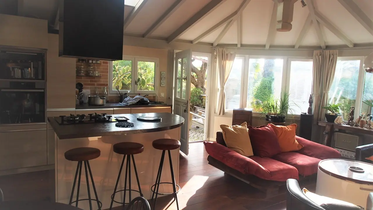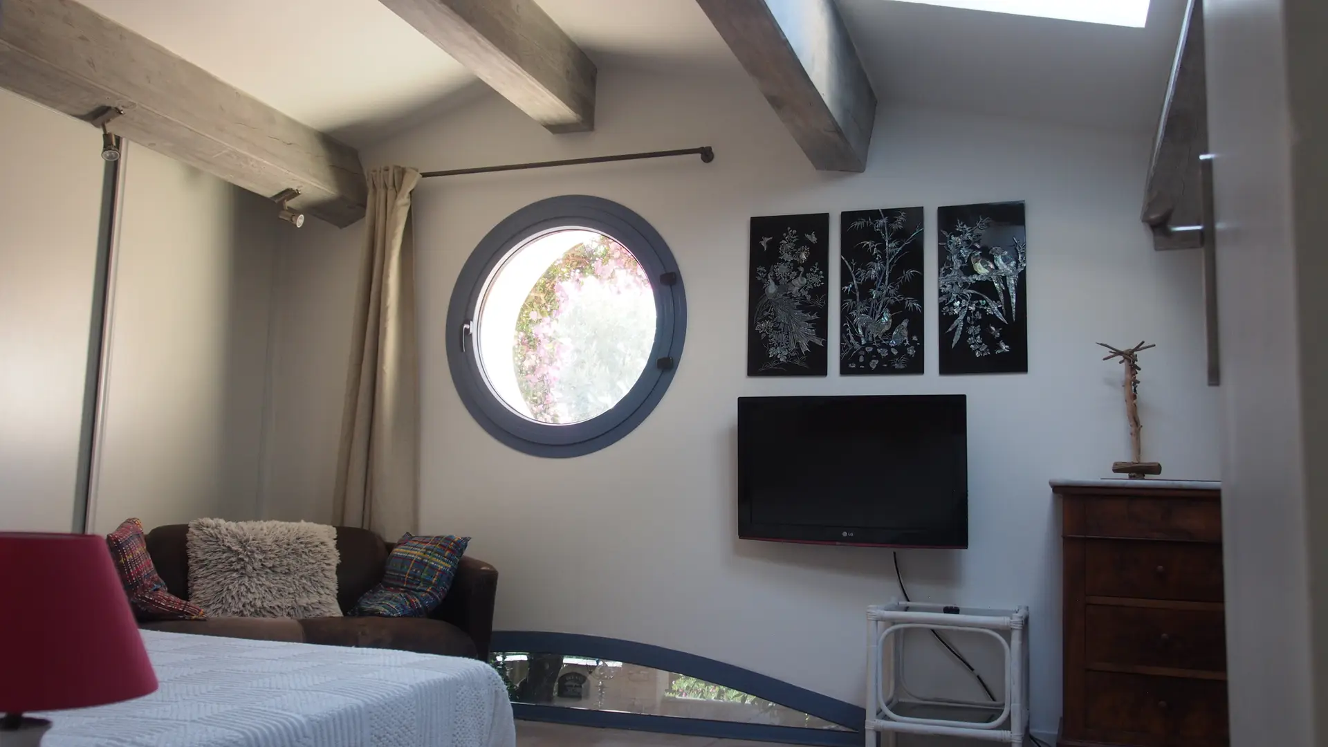 Al piano terra: un bel soggiorno luminoso in stile coloniale con cucina completamente attrezzata (televisione, internet, hi-fi bluetooth, ecc.) + una grande camera da letto (letto da 160 cm) che si apre sulla terrazza e il suo bagno privato (vasca + doccia) + lavanderia (lavatrice, asciugatrice) + wc separato.