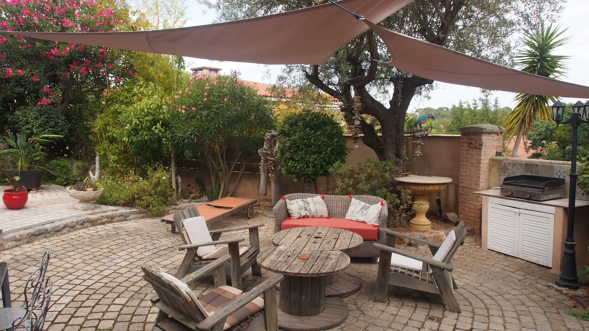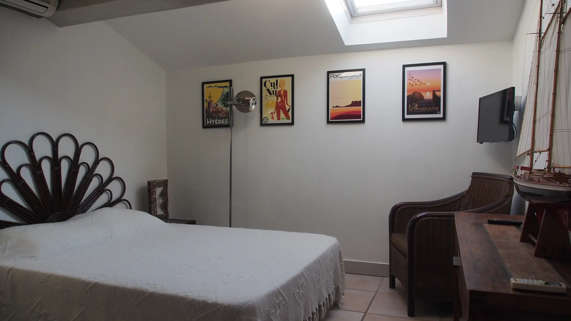 Non lontano dalla penisola di Giens, di fronte alle Isole d'Oro (Porquerolles, Port Cros e Le Levant), la casa comprende una terrazza e un giardino dalle essenze mediterranee, un patio che invita al relax, un'amaca, una fontana... un bel soggiorno luminoso dal fascino coloniale e una cucina completamente attrezzata.