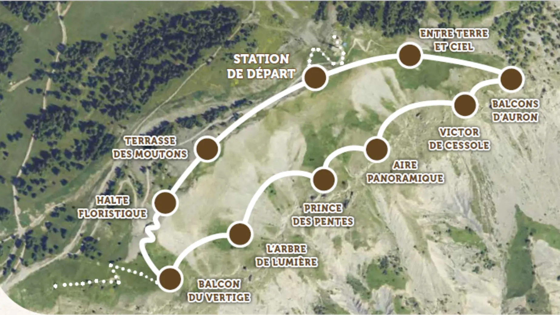 Per tornare al punto di partenza, percorrete il sentiero di scoperta dei Balcons d'Auron, che vi farà fare il giro completo della vetta (2,5 km). Durante la vostra escursione, il paesaggio del Mercantour cambierà, svelandovi gradualmente i suoi segreti. Dieci aree di interpretazione, disposte con discrezione, vi permetteranno di riprendere fiato e fare scoperte inaspettate. Prima di partire, posizionatevi al centro della tabella di orientamento e individuate le cime più emblematiche del Mercantour.