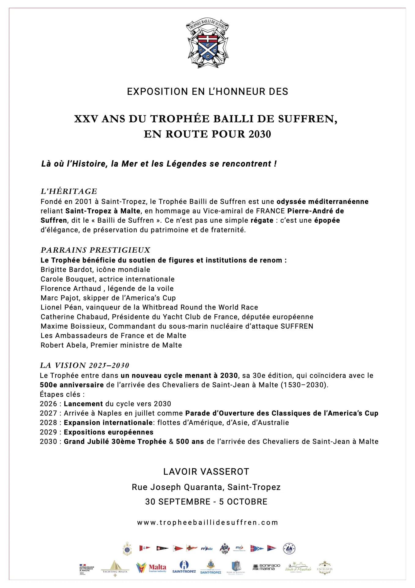 Nato nel 2001 a Saint-Tropez, il Trophée Bailli de Suffren è un'odissea nel Mediterraneo che collega Saint-Tropez a Malta, in omaggio al viceammiraglio francese Pierre-André de Suffren, detto "Bailli de Suffren". È più di una semplice regata: è un racconto epico di eleganza, conservazione del patrimonio e fratellanza.