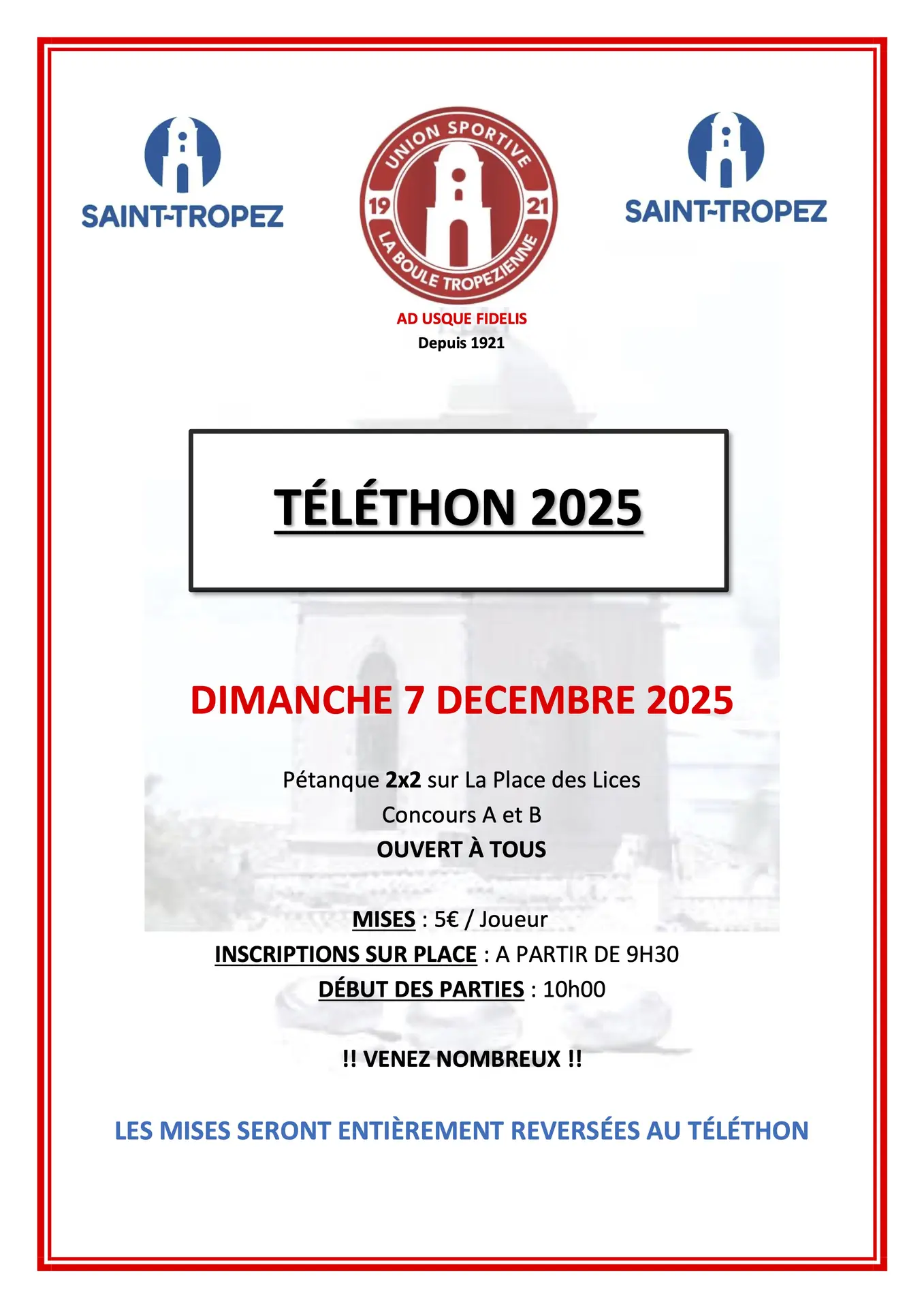 L'Union Sportive La Boule Tropézienne vi aspetta domenica 7 dicembre 2025, sulla leggendaria Place des Lices di Saint-Tropez, per una giornata all'insegna del divertimento, dello sport e della solidarietà in occasione di Telethon, organizzata dal presidente dell'associazione, ABBE Guillaume.