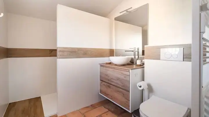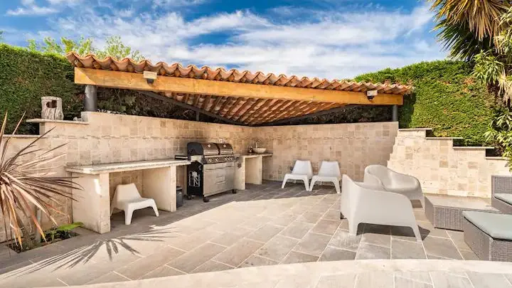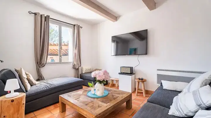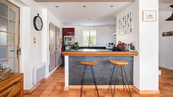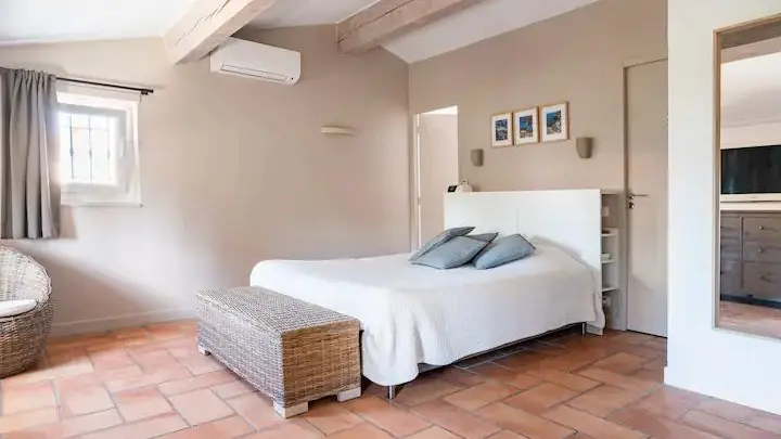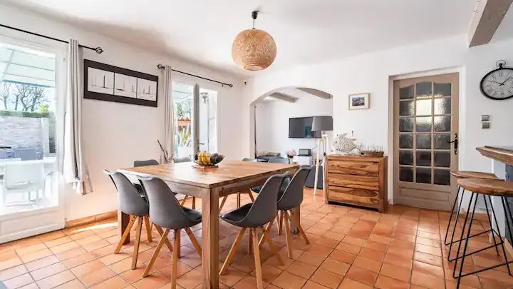 All'esterno, potrete rilassarvi su uno dei lettini disposti intorno alla piscina privata, riscaldata ed esposta a sud. È circondata da vegetazione mediterranea, da una doccia esterna e da un'ampia terrazza dove potrete gustare kebab e merguez preparati sul grande barbecue plancha della cucina estiva all'ombra del pergolato. Potrete anche sorseggiare un mojito (o una Perrier al limone dal giardino!) nel salotto in giardino riparato da una grande vela ombreggiante.