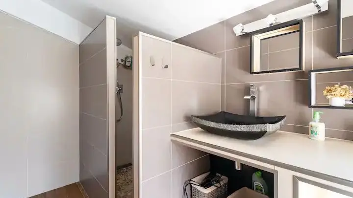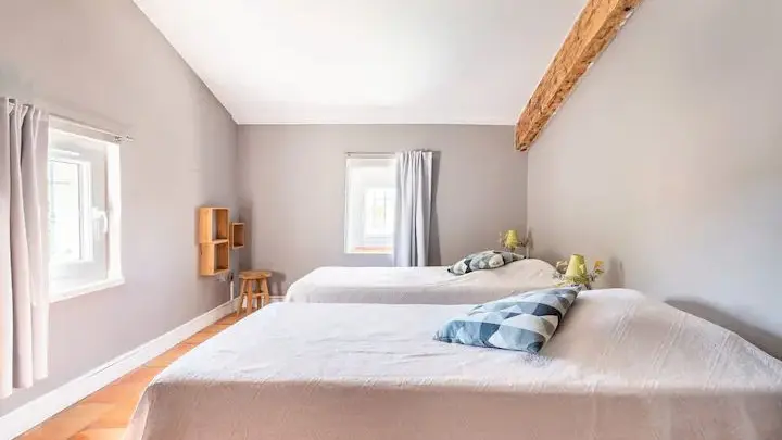La casa dispone di 4 camere da letto (2 per piano), 2 con letti matrimoniali (una con TV LED), 1 con 2 letti singoli e 1 con 2 letti a castello. Le 3 camere da letto principali sono dotate di aria condizionata. Tutti i letti hanno materassi nuovi in lattice. Su ogni piano ci sono 3 bagni con cabina doccia.