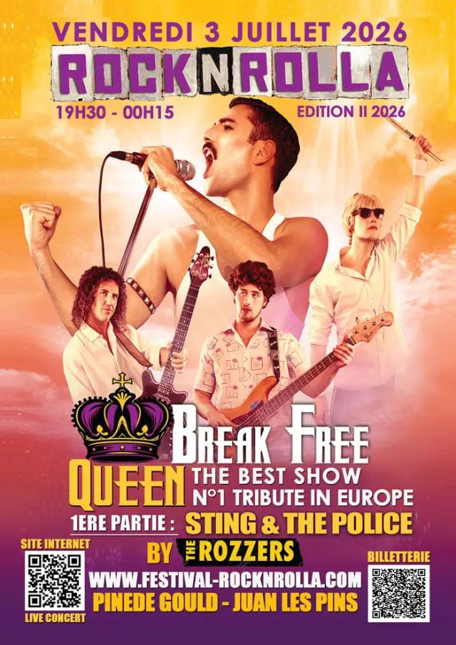 Quest’anno il festival rocknrolla celebra Bohemian Rapsody – Queen & The Police / Sting, uno spettacolo definito il miglior tributo d’Europa. Unitevi a noi venerdì 03 luglio 2026, dalle 19.30 alle 24.15, alla Pinède Gould (sul palco del Jazz Festival) di Juan les Pins, Antibes.